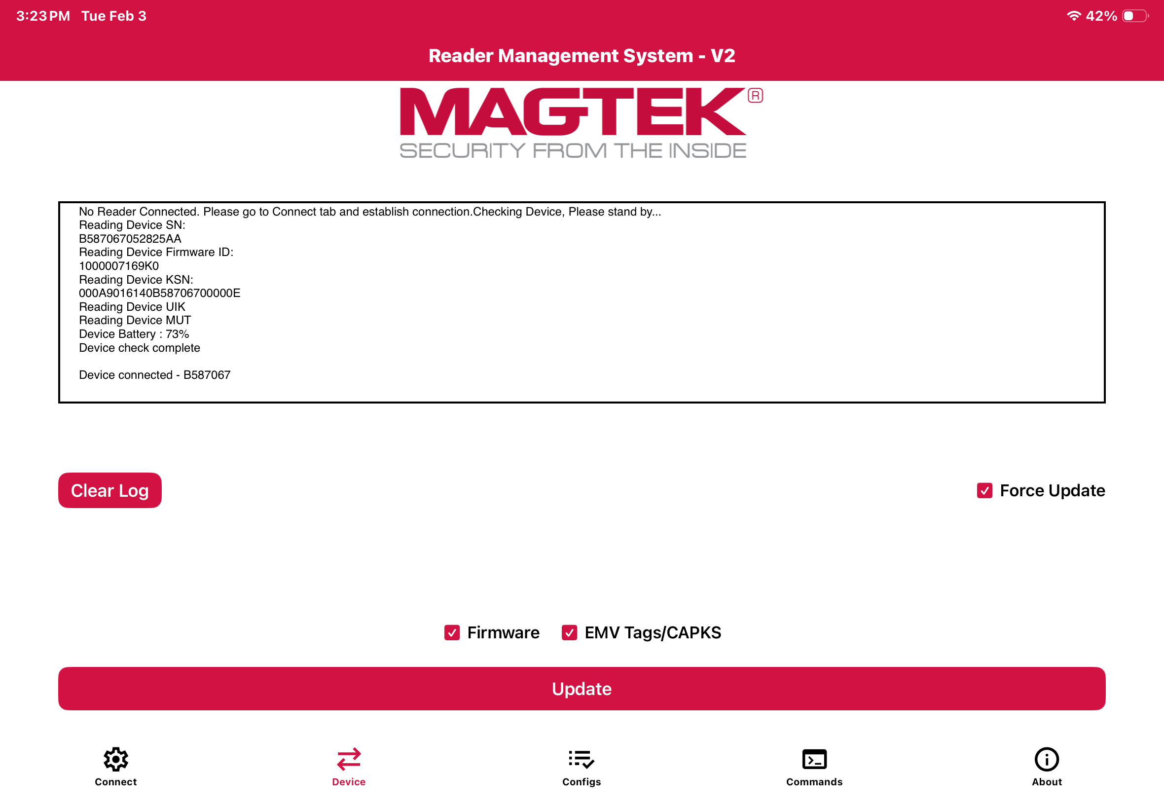 - Select "Force Update" along with "Firmware" and "EMV Tags/CAPKS" and then tap the "Update" button